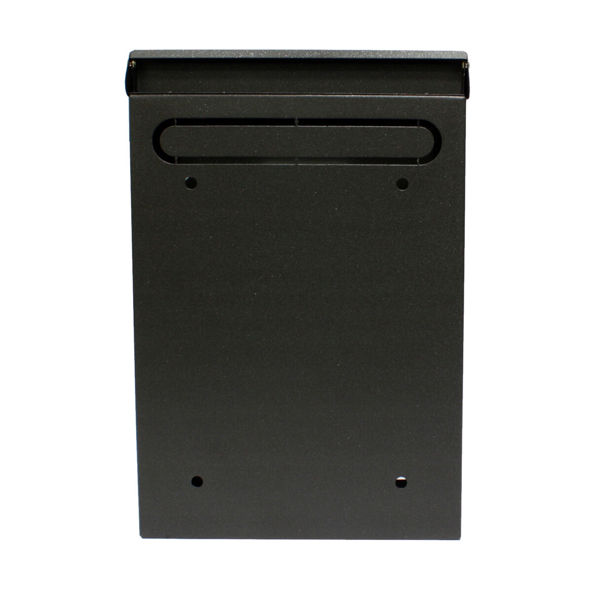 A mailbox with dimensions 380x260x70mm, made of steel sheet coated with epoxy resin. The mailbox features a top slot with a protective cover. The door has a transparent plastic window, allowing for the placement of an identification plate with an address or name.